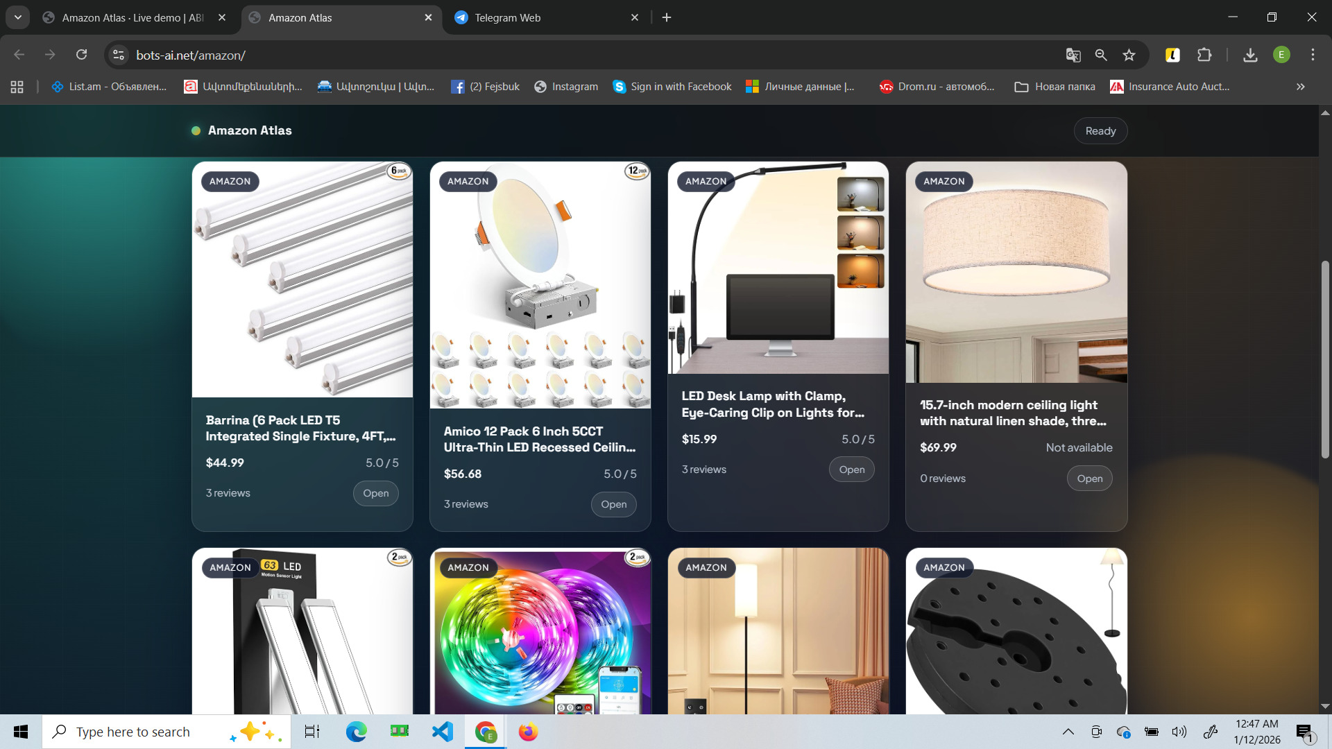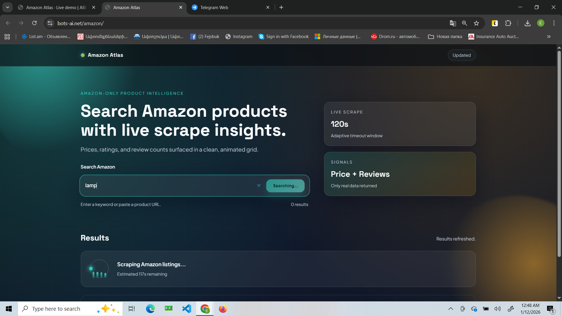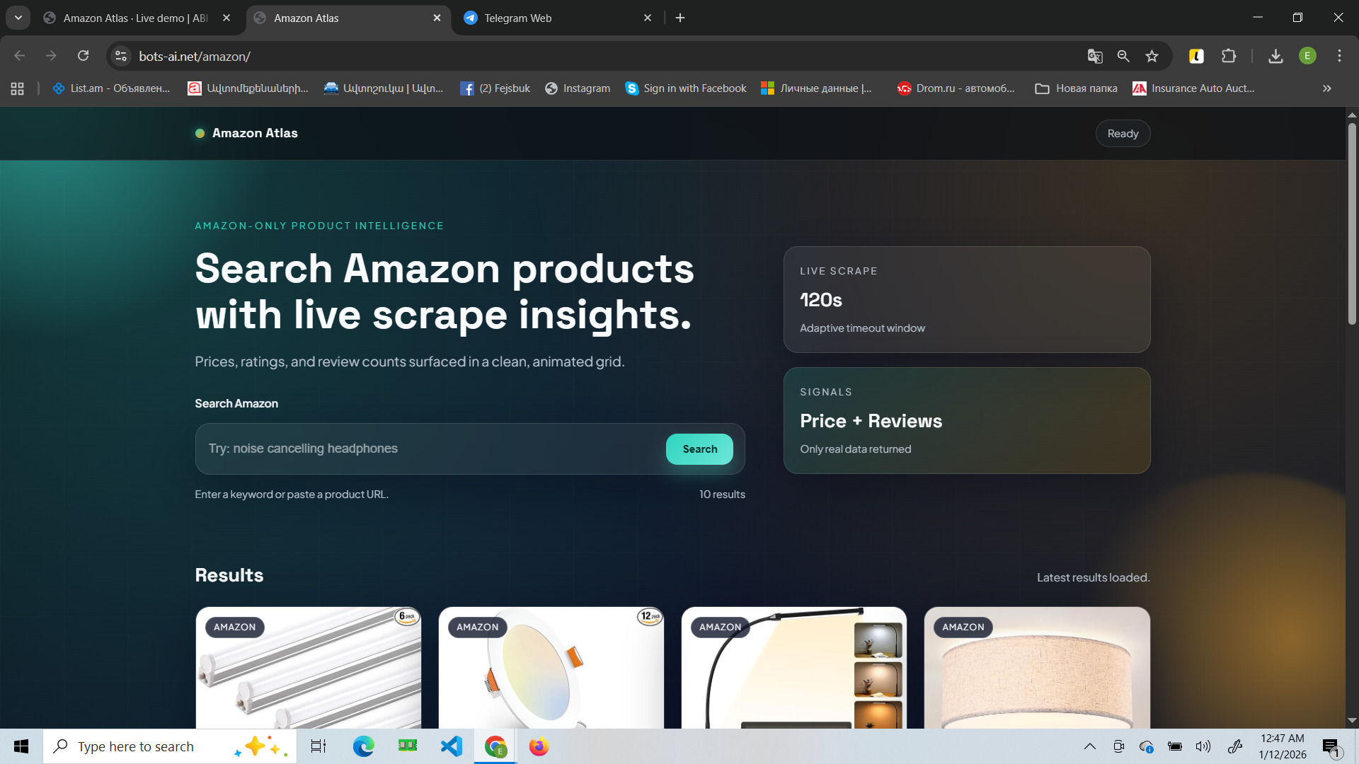 This site is a web tool for searching products on Amazon and pulling “live” data via scraping directly in the interface. You enter a keyword or paste a product URL, and the system fetches and displays results as cards with the key signals: price, rating, and review count.