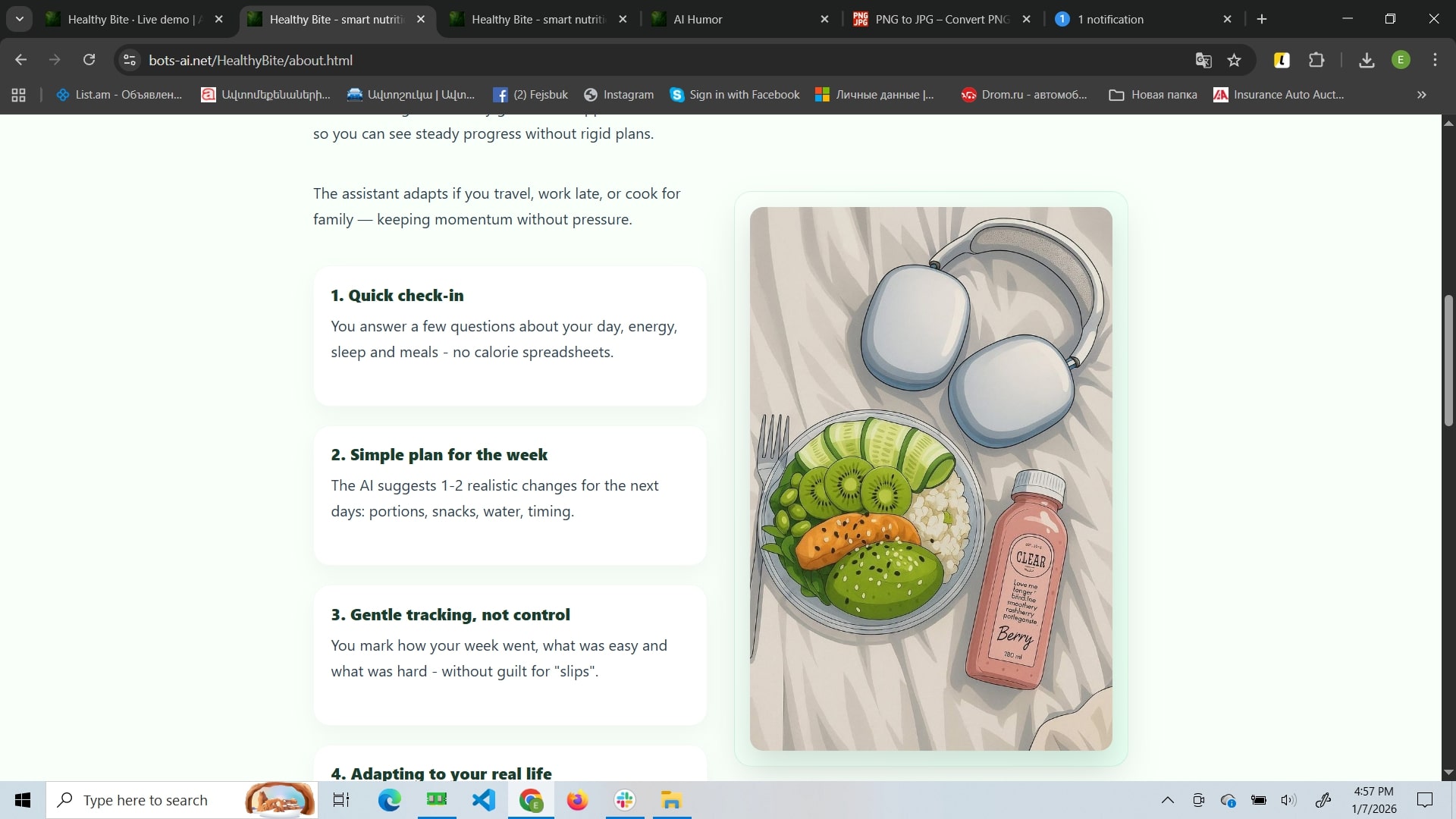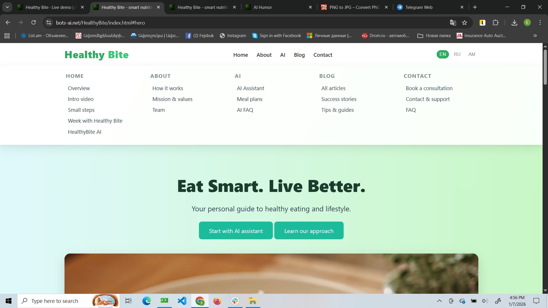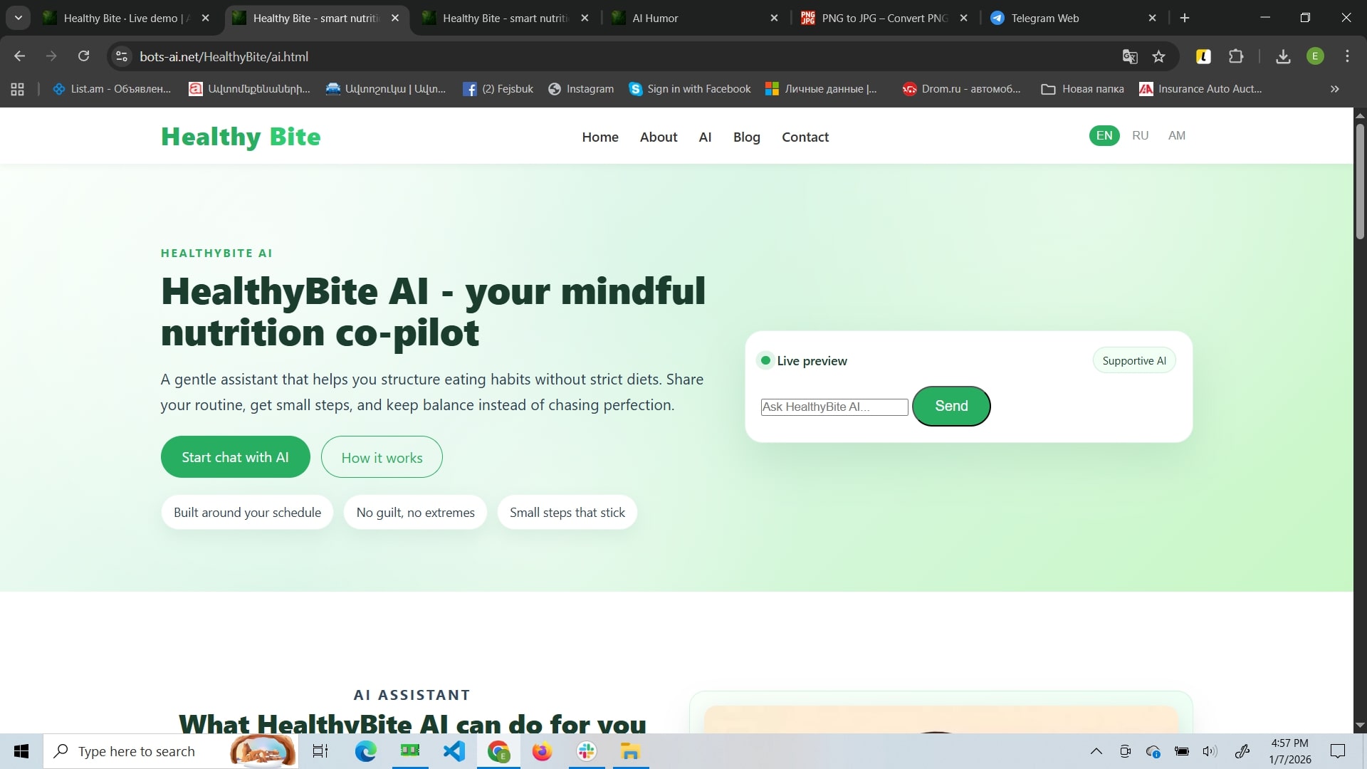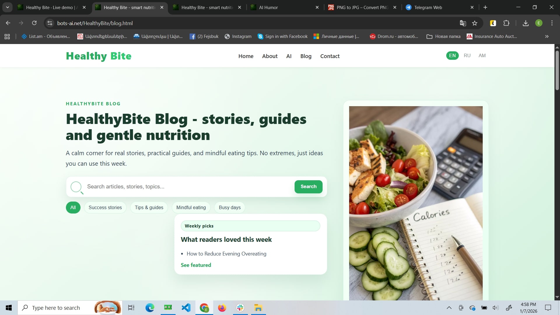 Healthy Bite is a mindful nutrition website focused on sustainable habit-building rather than strict diets. Its core feature is an AI assistant that adapts suggestions to your routine and helps you create flexible meal structures and weekly plans. The site also includes a blog with practical guides and success stories, plus a contact area for support and booking consultations.