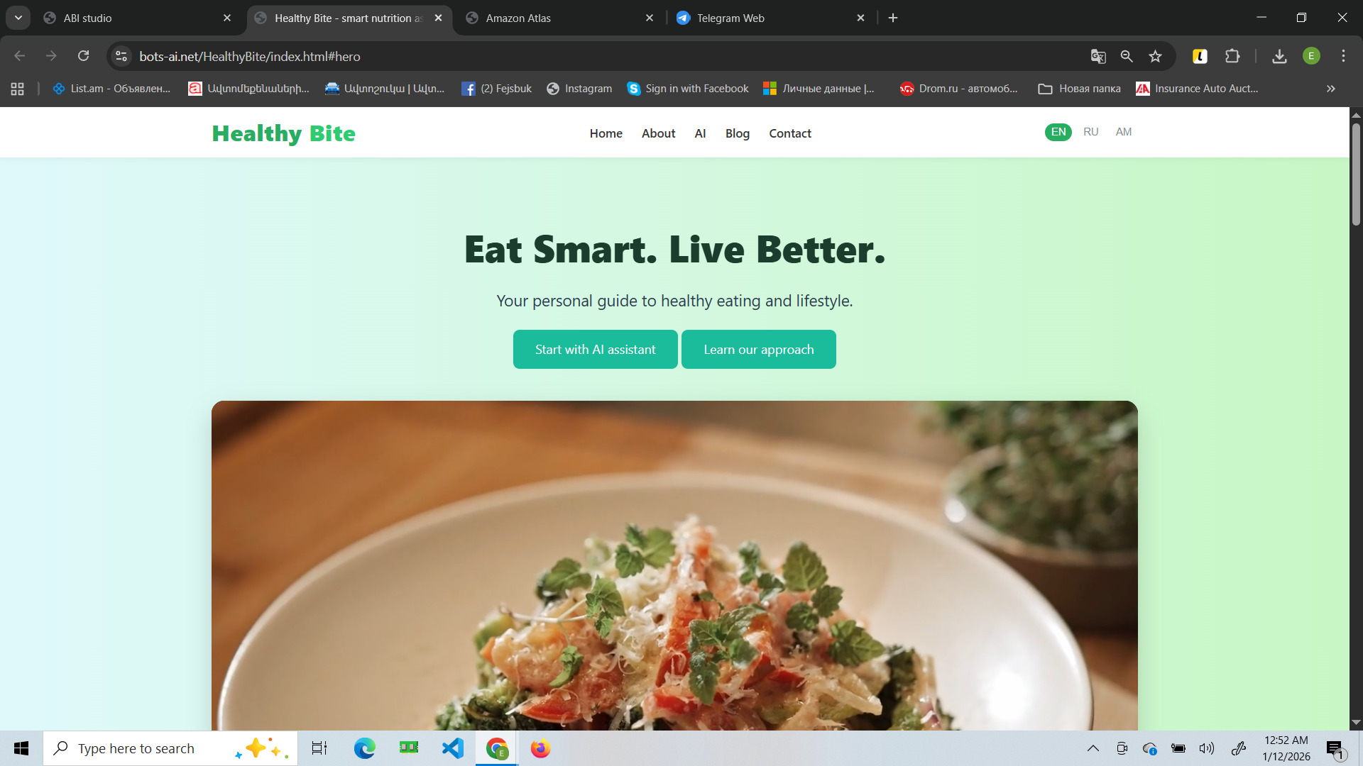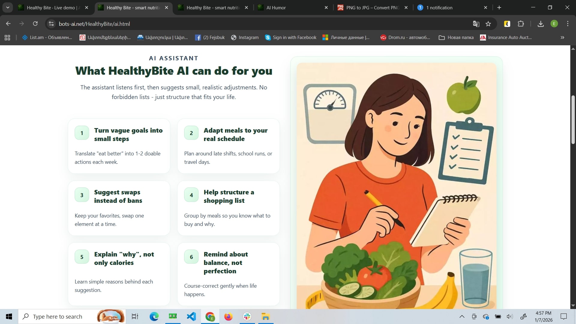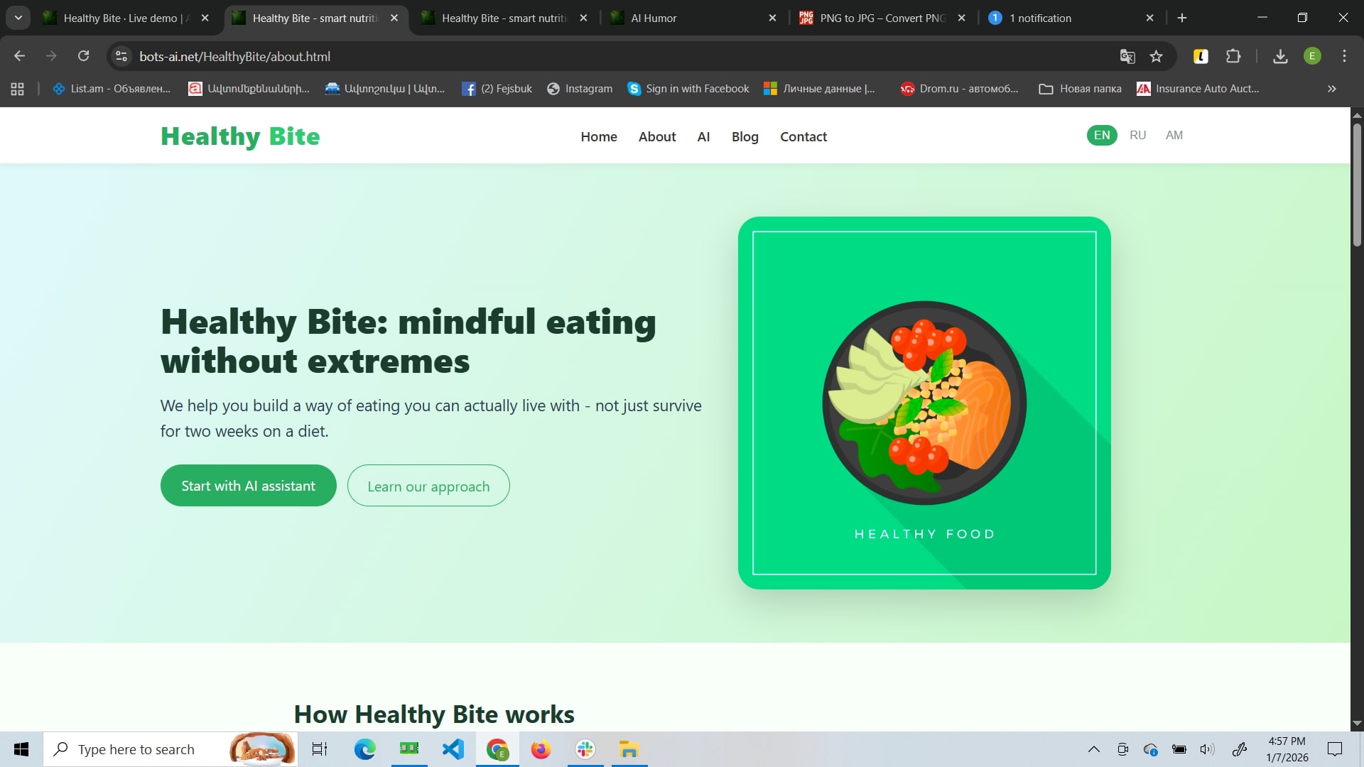 Healthy Bite is a mindful nutrition website focused on sustainable habit-building rather than strict diets. Its core feature is an AI assistant that adapts suggestions to your routine and helps you create flexible meal structures and weekly plans. The site also includes a blog with practical guides and success stories, plus a contact area for support and booking consultations.