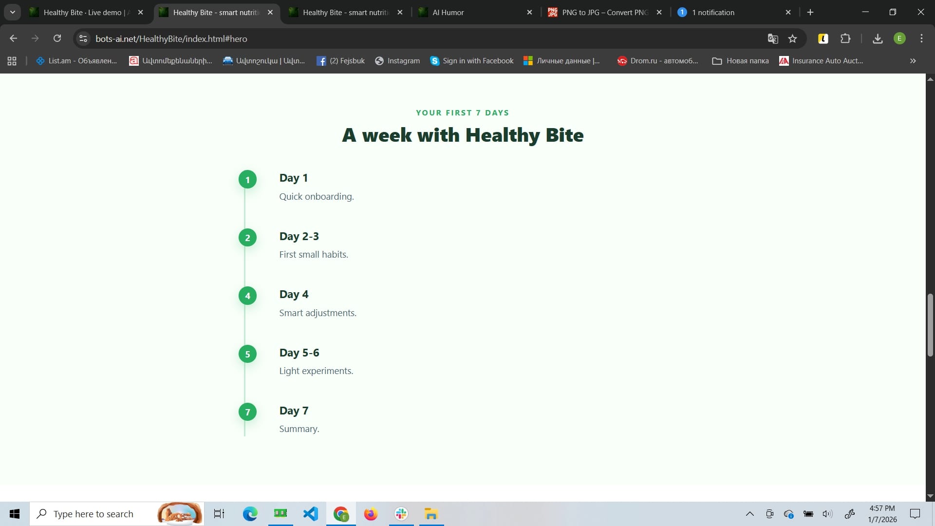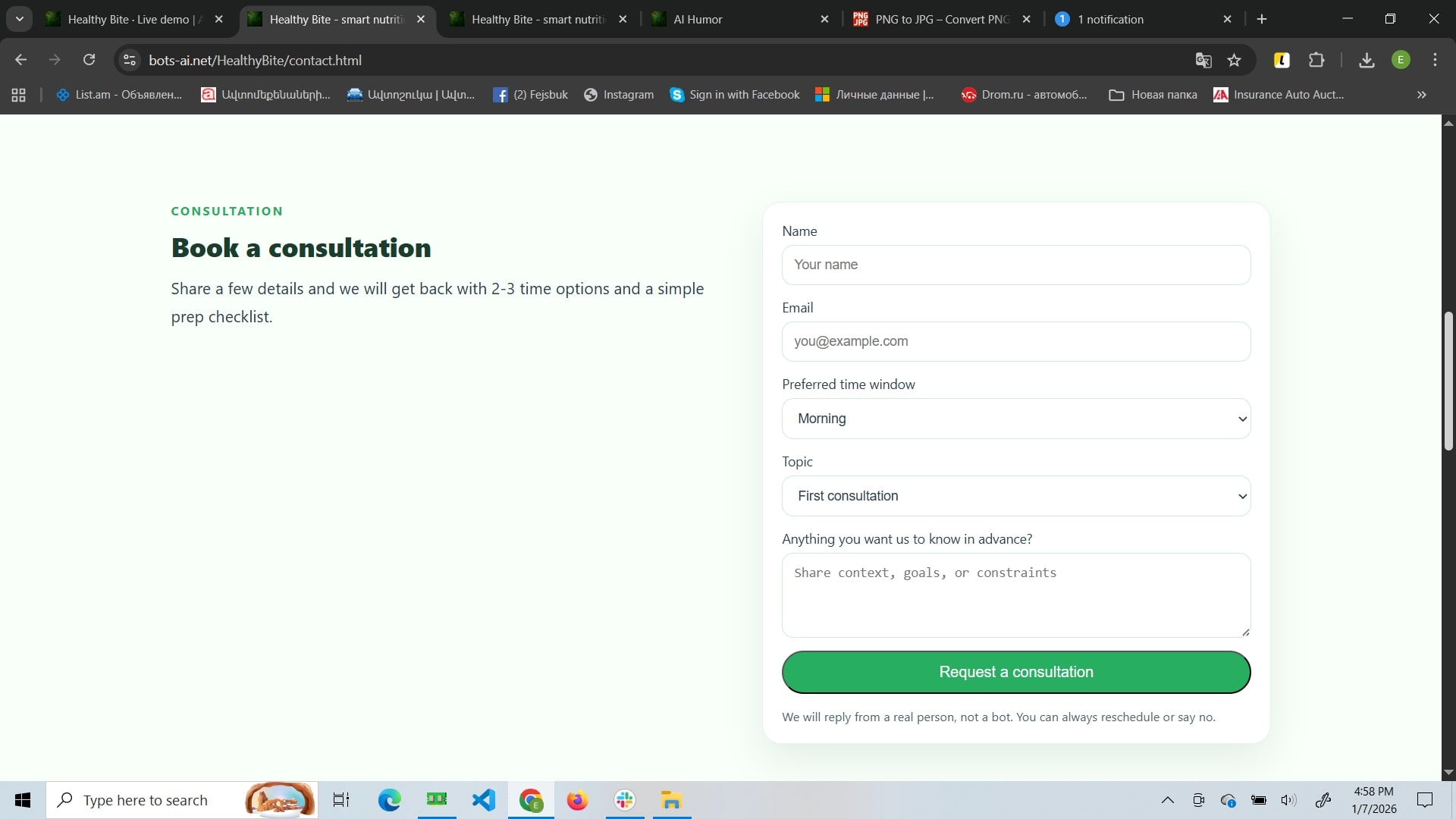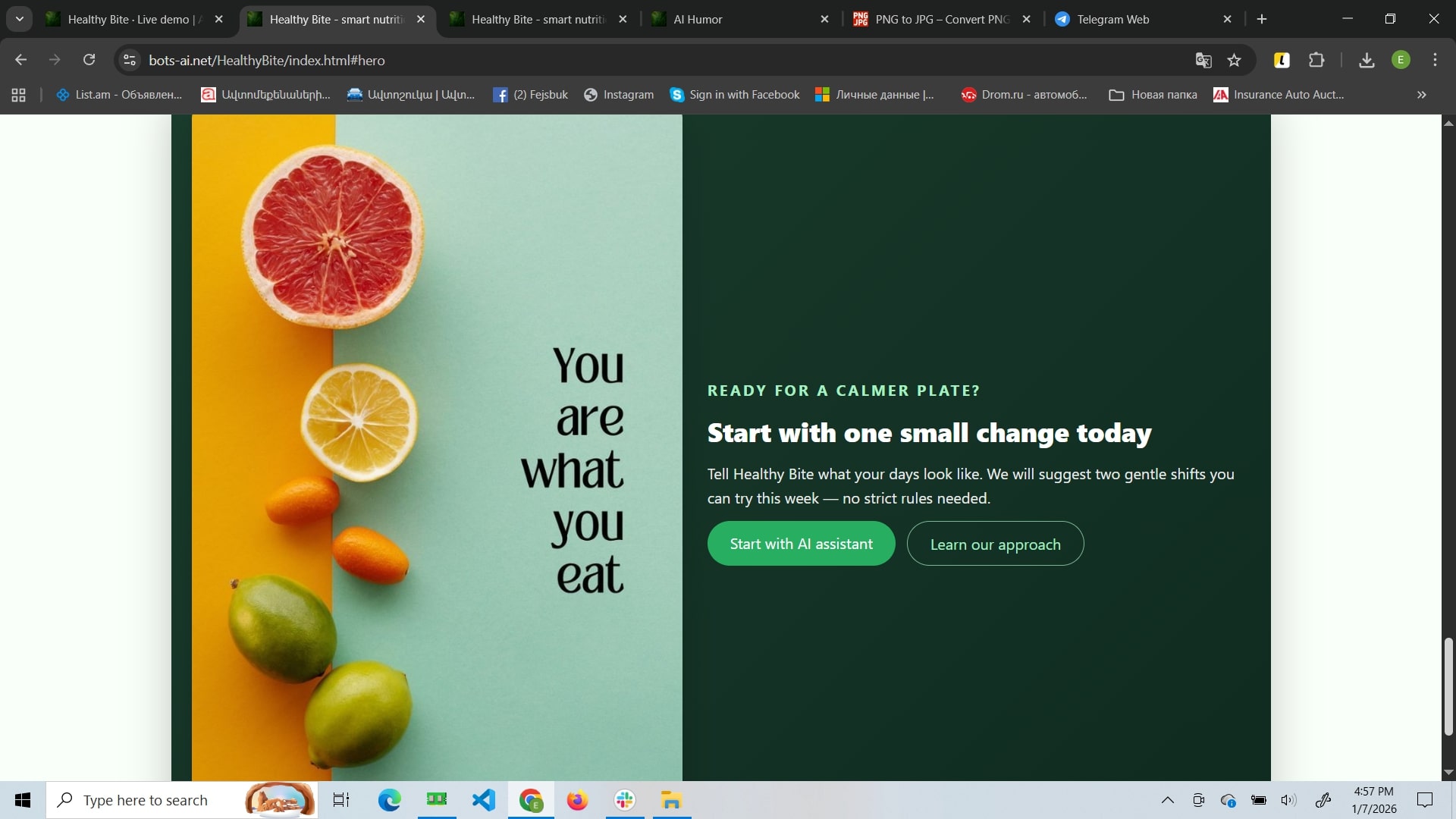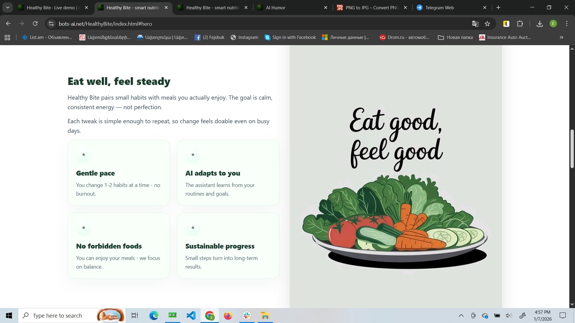 Healthy Bite is a mindful nutrition website focused on sustainable habit-building rather than strict diets. Its core feature is an AI assistant that adapts suggestions to your routine and helps you create flexible meal structures and weekly plans. The site also includes a blog with practical guides and success stories, plus a contact area for support and booking consultations.