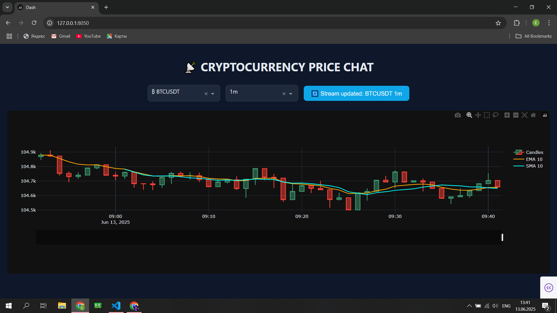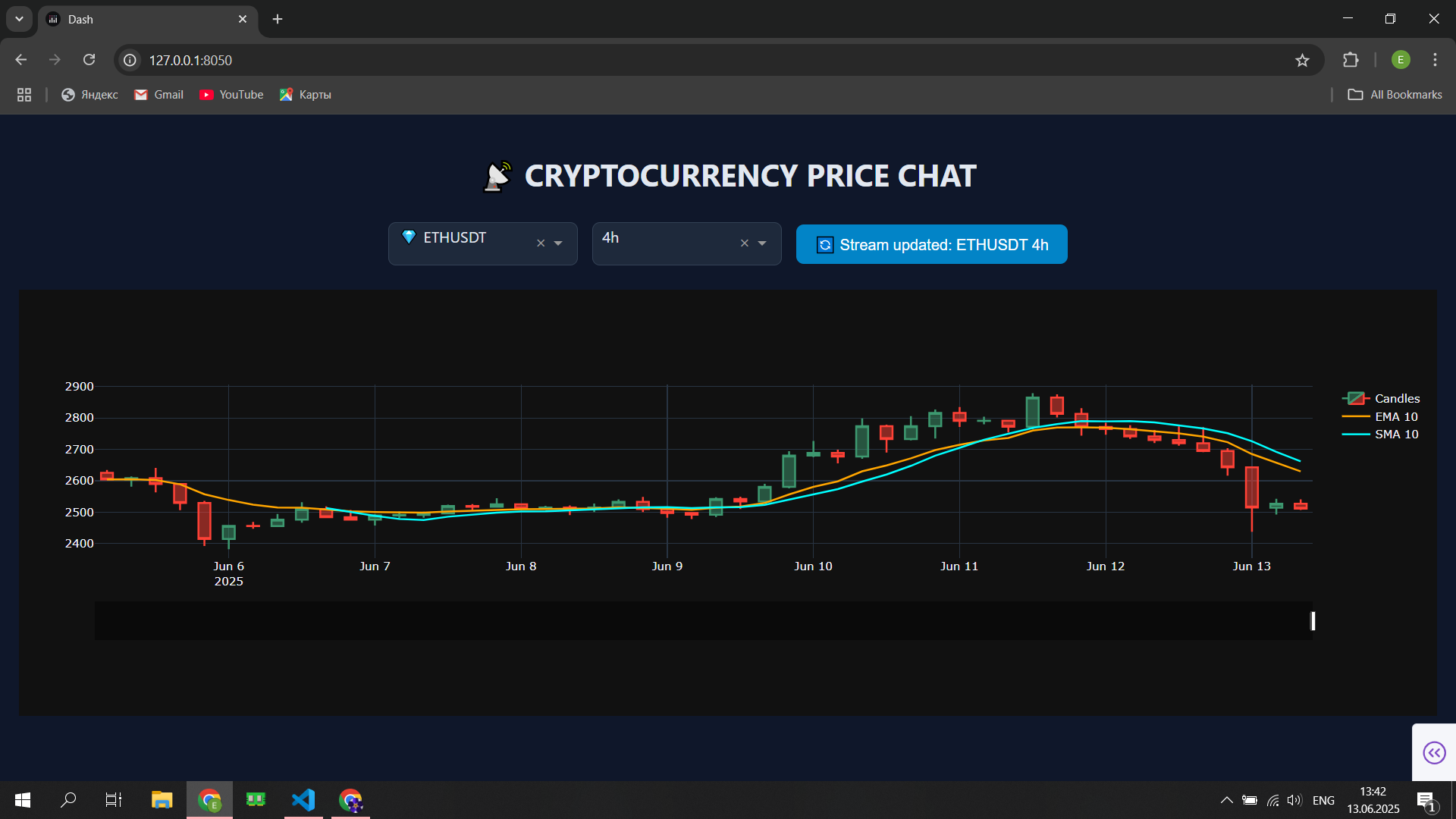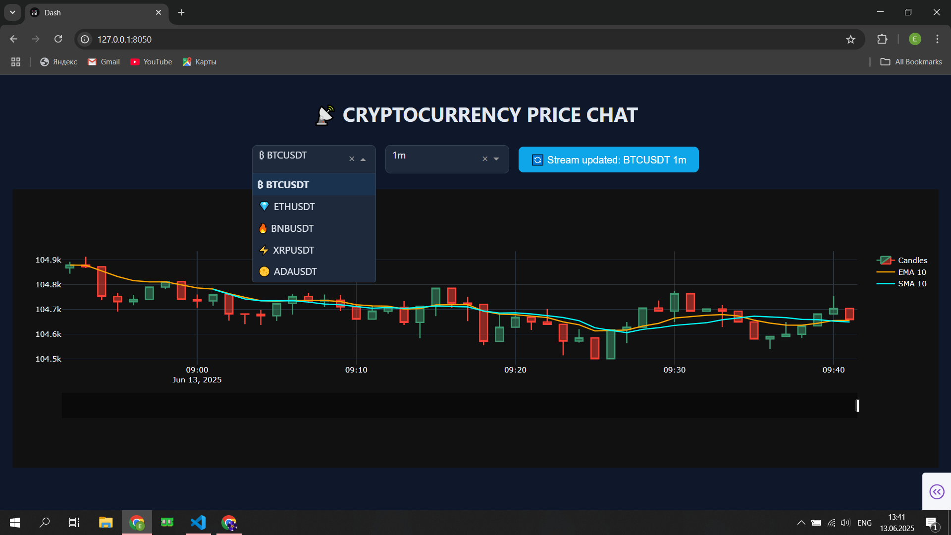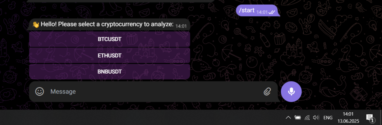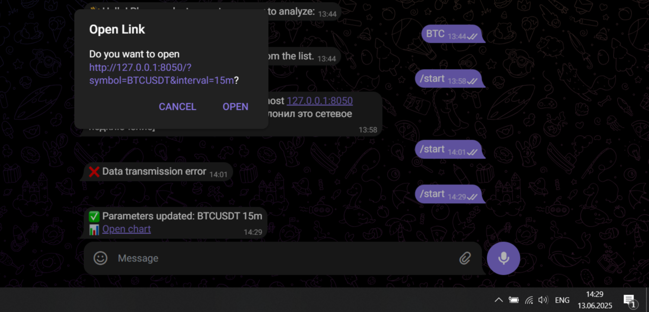 Delivered a real-time crypto monitoring experience with continuous WebSocket streaming (no manual refresh). Reduced time-to-insight by adding interactive candlestick charts with EMA/SMA overlays. Enabled Telegram-first control: users pick a pair and timeframe in the bot and instantly open/update the chart. Kept the experience consistent via server-side state sync between the dashboard and Telegram bot.